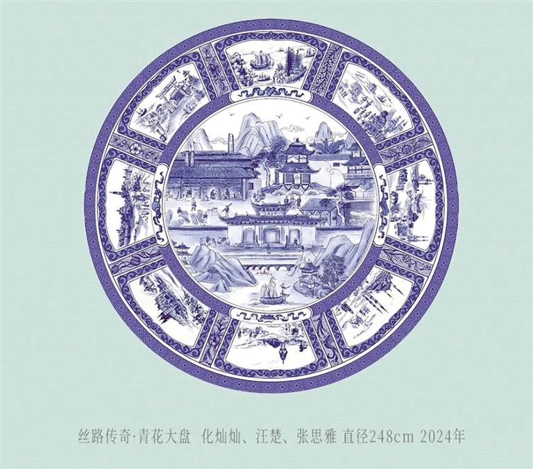 值得關注的是,展品中既有莫高窟第328窟復制彩塑這樣的經典再現,也有直徑達248厘米的“絲路傳奇·青花大盤”,呈現出多元文明共生的歷史圖景。瓷器作品是江西瓷藝大師歷時多年、多次赴敦煌采風創(chuàng)作的結晶,通過高溫顏色釉的窯變特性,將敦煌壁畫的斑駁肌理與礦物顏料的神秘色彩凝固定格,在釉色流淌間實現古典美學與現代工藝的完美融合。