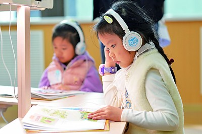 山東青島,小朋友在閱讀館體驗AI閱讀。新華社發(fā)