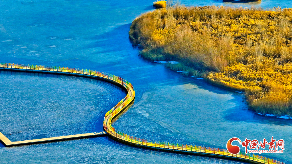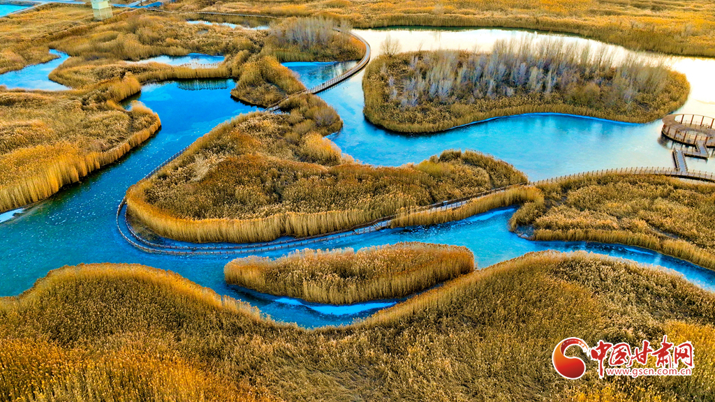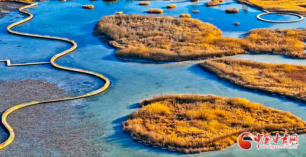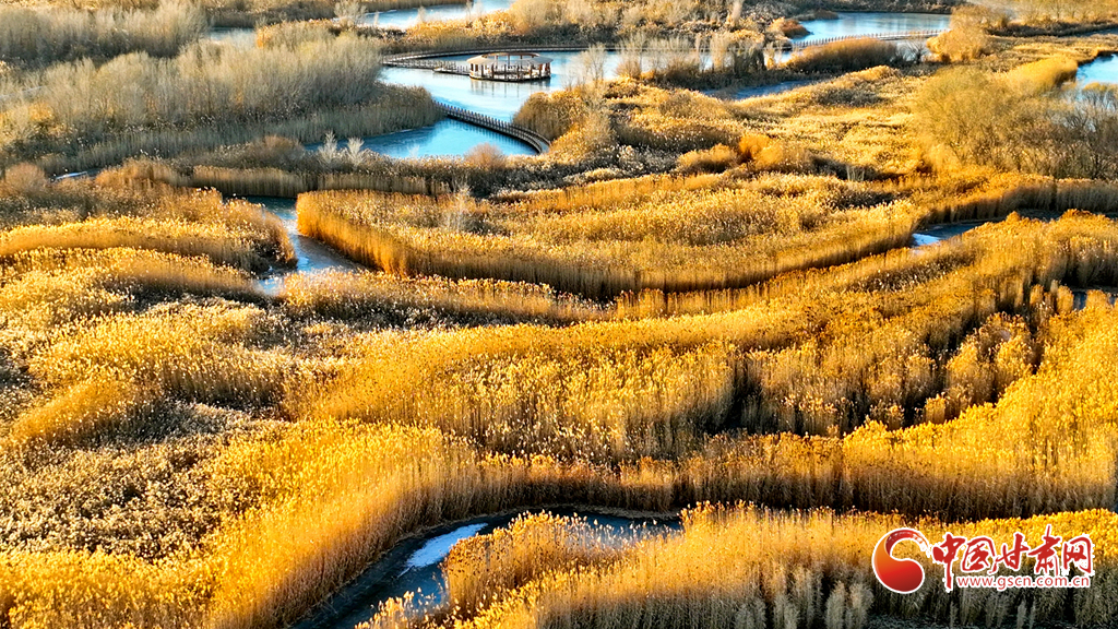 12月4日,張掖市黑河濕地國(guó)家級(jí)自然保護(hù)區(qū)內(nèi),經(jīng)風(fēng)霜浸染的蘆葦與蒲草披上金裝。從高空俯瞰,夕陽(yáng)下的蘆葦蕩如金色海洋,蘆花隨風(fēng)輕舞,碧水凝冰環(huán)繞其間,宛如一幅鋪展的濕地金畫卷,吸引眾多游客與攝影愛好者前來觀賞拍攝。