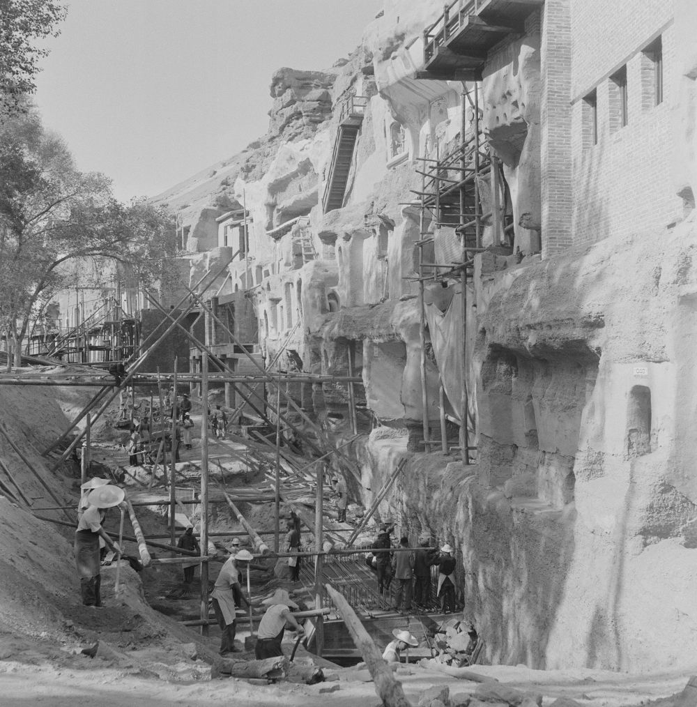 敦煌研究院工作人員對莫高窟部分洞窟進行加固施工(1964年7月8日攝)。新華社發(fā)