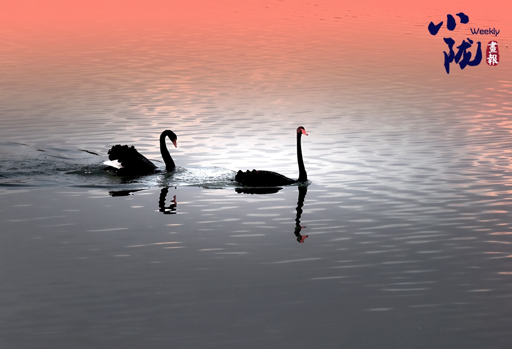 水面平靜如鏡,野生黑天鵝舒展雙翼,揚著頸脖,在水中游弋劃波,時而低頭覓食,時而相互依偎,成雙成對上演冬日浪漫。