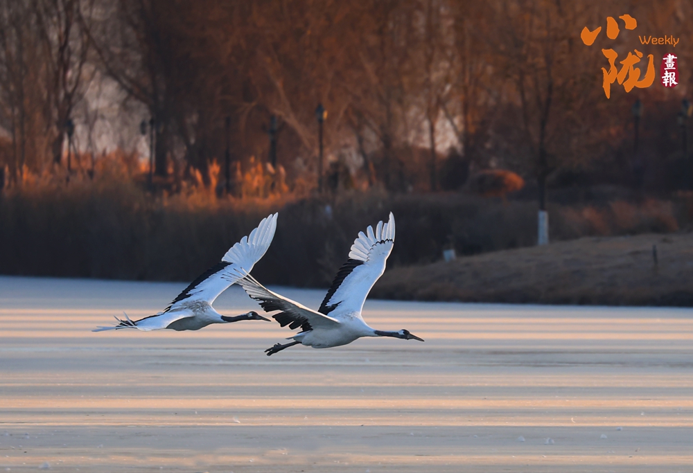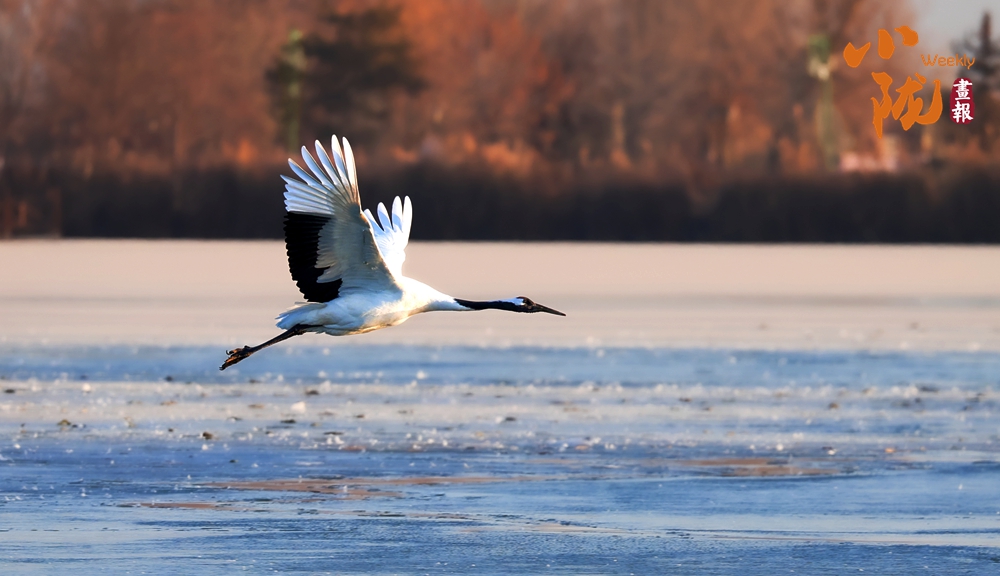 冰面映照著澄澈藍(lán)天,丹頂鶴展翅掠水,引頸高歌,清脆的鳴叫聲仿佛是大自然奏響的美妙樂章。
