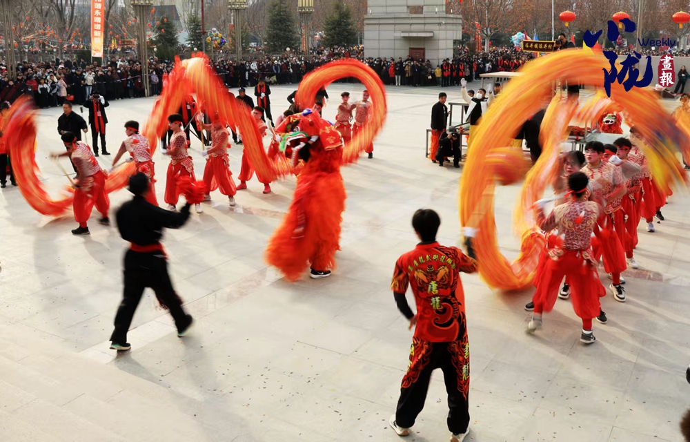 兩條金龍翻江倒海,踏著鼓點(diǎn)蜿蜒游走。舞龍的小伙子們步伐矯健,巨龍?jiān)谒麄兊氖种袝r而盤旋昂首,時而穿梭遨游,龍身隨著龍珠上下起伏,氣勢雄武遒勁。