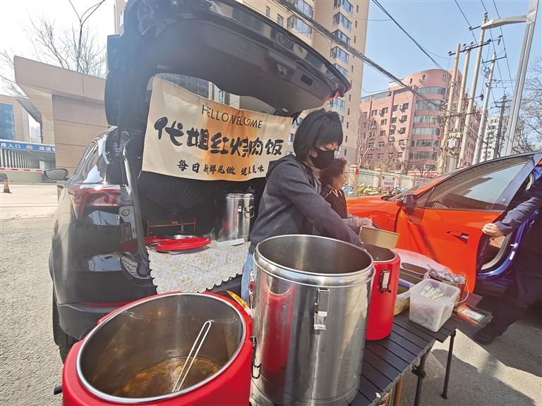 上午11時20分,甘南路民族飯店門口的人行道上,一輛簡易流動餐車準時支起攤位。不銹鋼餐盆里,色澤鮮亮的炒肉片蓋飯熱氣升騰,濃郁香氣順著風(fēng)飄向周邊寫字樓,短短幾分鐘,攤位前就排起了七八人的小長隊。“老板,一份炒肉片蓋飯,多放青椒和咸菜!”“我要兩份,打包帶走!”熟練打飯、快速裝盒、掃碼收款,一氣呵成,不到20分鐘,桶里的米飯就下去了小半桶。