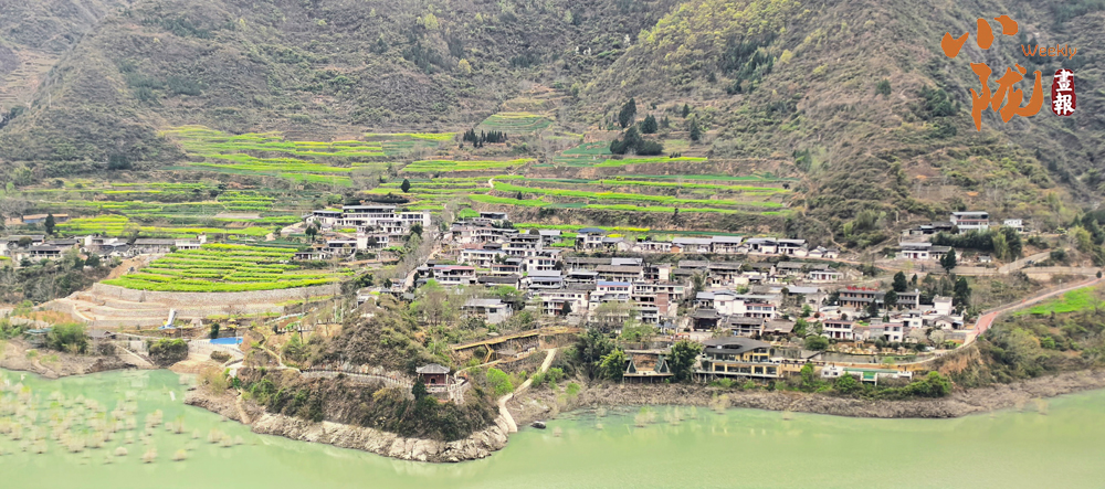 那一叢叢、一簇簇的油菜花,沿著梯田層層疊疊,從江邊一直蔓延到半山腰,鋪展在青山碧水之間;又像是大地剛剛蘇醒時,打翻的調(diào)色盤。