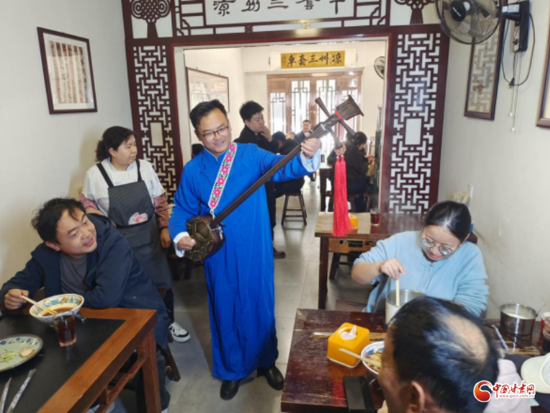 當(dāng)日,北關(guān)市場內(nèi)人流如注、熙熙攘攘,眾多游客與市民齊聚于此,享受美味的同時觀看涼州賢孝和永昌滾燈,涼州賢孝傳承人賈旭峰與用餐的游客進(jìn)行了互動,人們安逸地享受著這份獨(dú)具涼州特色的煙火美味。