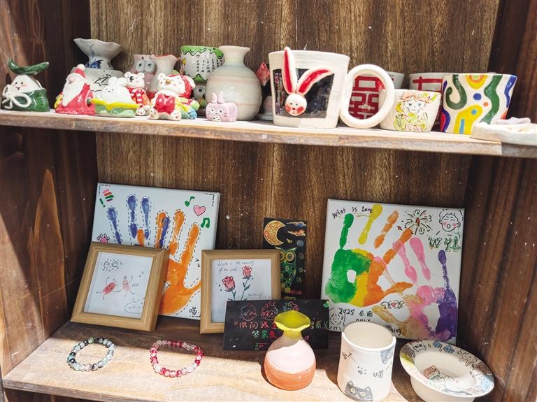 貨架上,各類手工成品整齊擺放:色彩豐富的拼豆掛件、簡約精致的銀戒指、溫潤質(zhì)樸的陶土杯、造型可愛的石膏玩偶,每一件都帶著手工獨(dú)有的溫度。