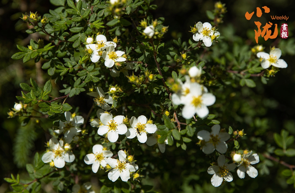 銀露梅,屬于薔薇科委陵菜屬落葉灌木。它多生長在高海拔的山坡、巖石縫中,葉片羽狀分裂,邊緣帶鋸齒,白色小花簇?fù)黹_放,花蕊明黃,花期在5-7月,耐寒耐旱,是頗具觀賞價(jià)值的野生植物。